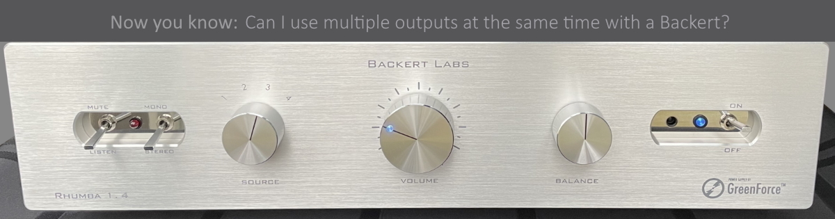 Actually, there is a 5th output on every Backert Labs linestage preamp. We include a “RECORD OUT” which always outputs full volume (the full volume of your music source).