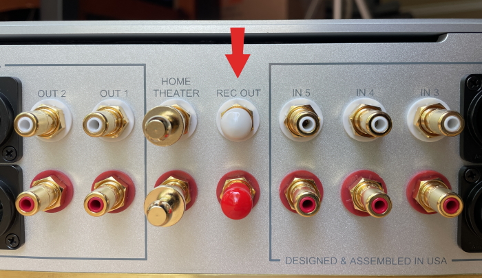 Labeled REC OUT, this full-volume output pair cannot be controlled by the volume knob. And it will not mute if you throw the mute switch. Because it always delivers full volume, we cover this output with plastic caps, as shown in the photo. By requiring you to do a little work to access them, we hope they will never be connected unintentionally.