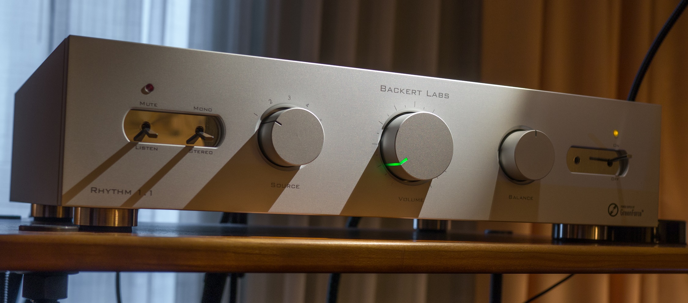 The aforementioned Gershman Acoustics speaker was fronted by Backert Labs’ new Rhythm 1.1 tubed linestage ($7500). Its power supply eschews electrolytic caps; instead, it runs on premier V-Cap Teflon units.